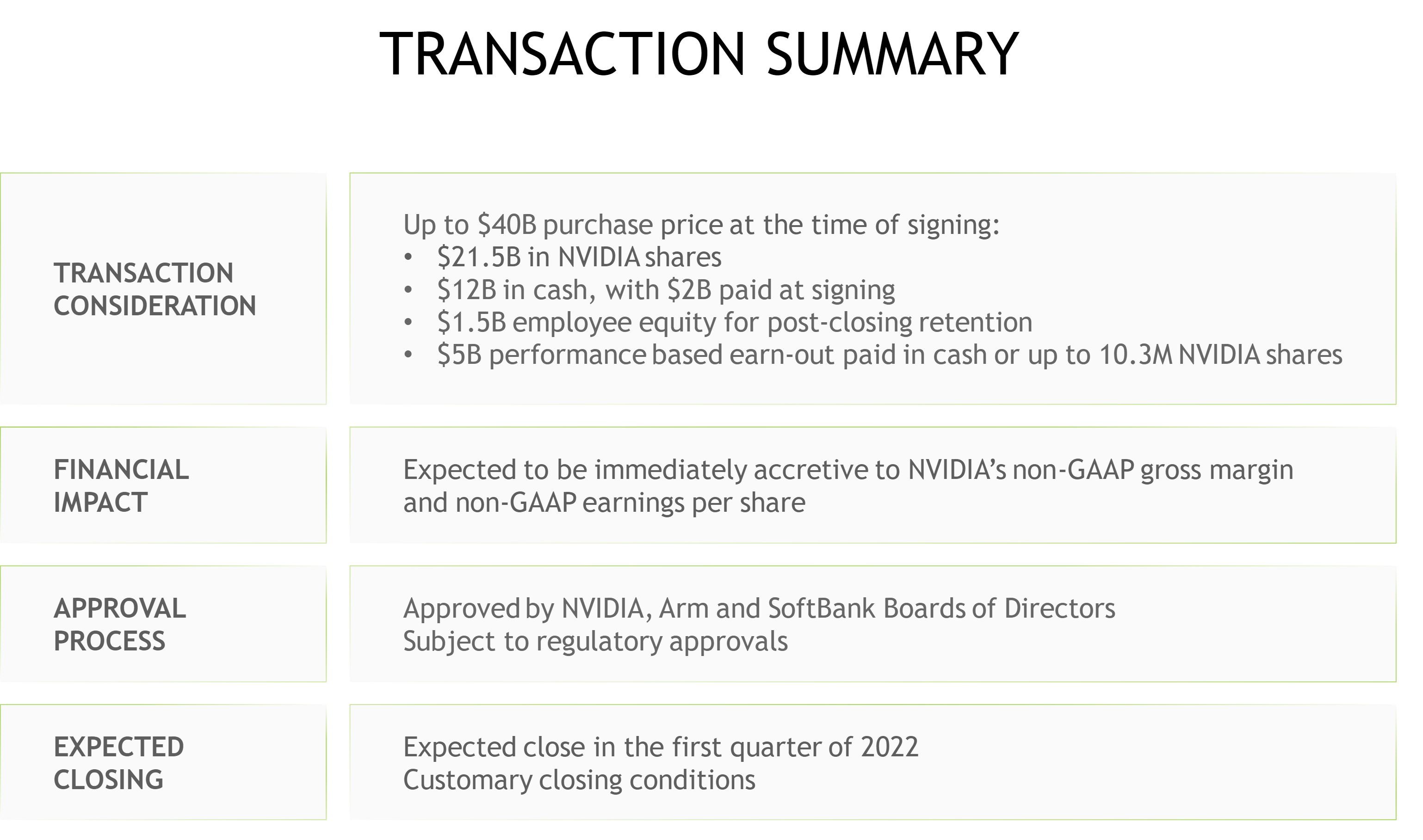 우선 엔비디아는 21.5조 가량의 주식을 소프트 뱅크에게 넘기며, 2조는 이미 지불하였으며 10조를 또한 더 지불해야 합니다. 1.5조 가량의 임직원 스탁옵션과 5조 가량의 현금 혹은 천만주 가량을 넘기기로 하였습니다.